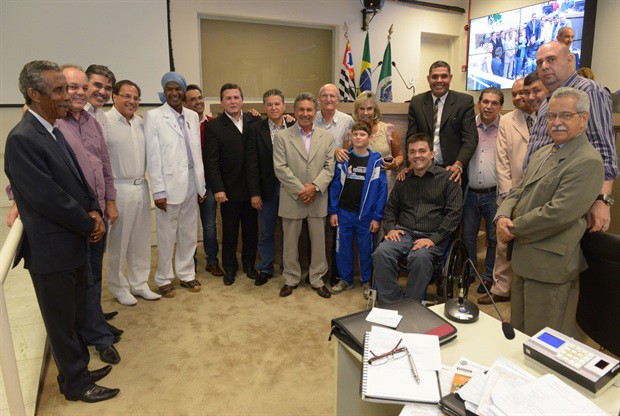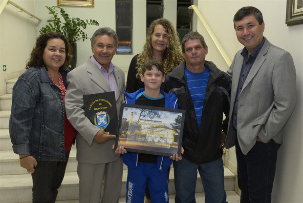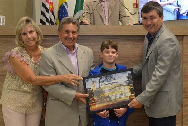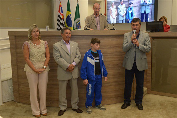 Foi entregue durante a reunião ordinária desta quinta-feira (15) uma Moção de Aplausos ao atleta Diobo Brajão, de 11 anos, campeão brasileiro de Ginástica Artística, categoria Pré-Infantil, realizado em Aracaju-SE. A iniciativa da homenagem foi do ex-vereador Gilmar Tanno (PSDB), mas na entrega na oportunidade também participaram da solenidade os vereadores Márcia Pacheco (PSDB) e Pedro Kawai (PSDB).