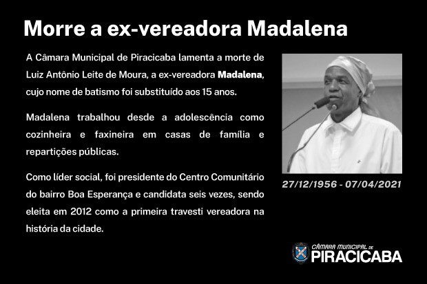 Piracicaba amanhece triste e lamenta a morte de Luiz Antônio Leite, a ex-vereadora Madalena, ocorrida nesta quarta-feria (7). O ícone piracicabano que se tornou respeitado por todos, por sua alegria, simplicidade e simpatia, foi o primeiro transexual, que de origem humilde, pobre, de cor negra e que em meio a tantas dificuldades, chegou ao poder legislativo de Piracicaba. Exemplo de luta, persistência e superação, hoje nos deixou para sempre. Descanse em paz. Seu velório acontece das 12 às 15 horas, no Cemitério da Vila Rezende. À tarde, o cortejo fúnebre percorreu ruas da cidade e, à frente da sede da Câmara, recebeu salva de palmas de vereadores, servidores e pedestres que gritavam por "justiça".