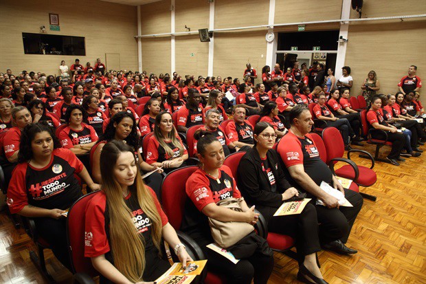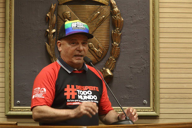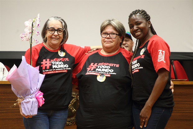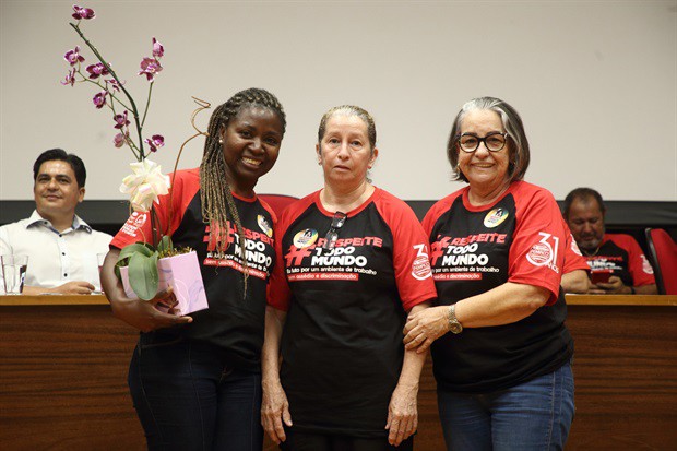 Em ato que lotou o salão nobre da Câmara na tarde desta quarta-feira (25), trabalhadores, lideranças sindicais e vereadores vestiram a camiseta vermelha e preta da campanha, que estampa a hashtag #RespeiteTodoMundo e a mensagem "Eu luto por um ambiente de trabalho sem assédio e discriminação".