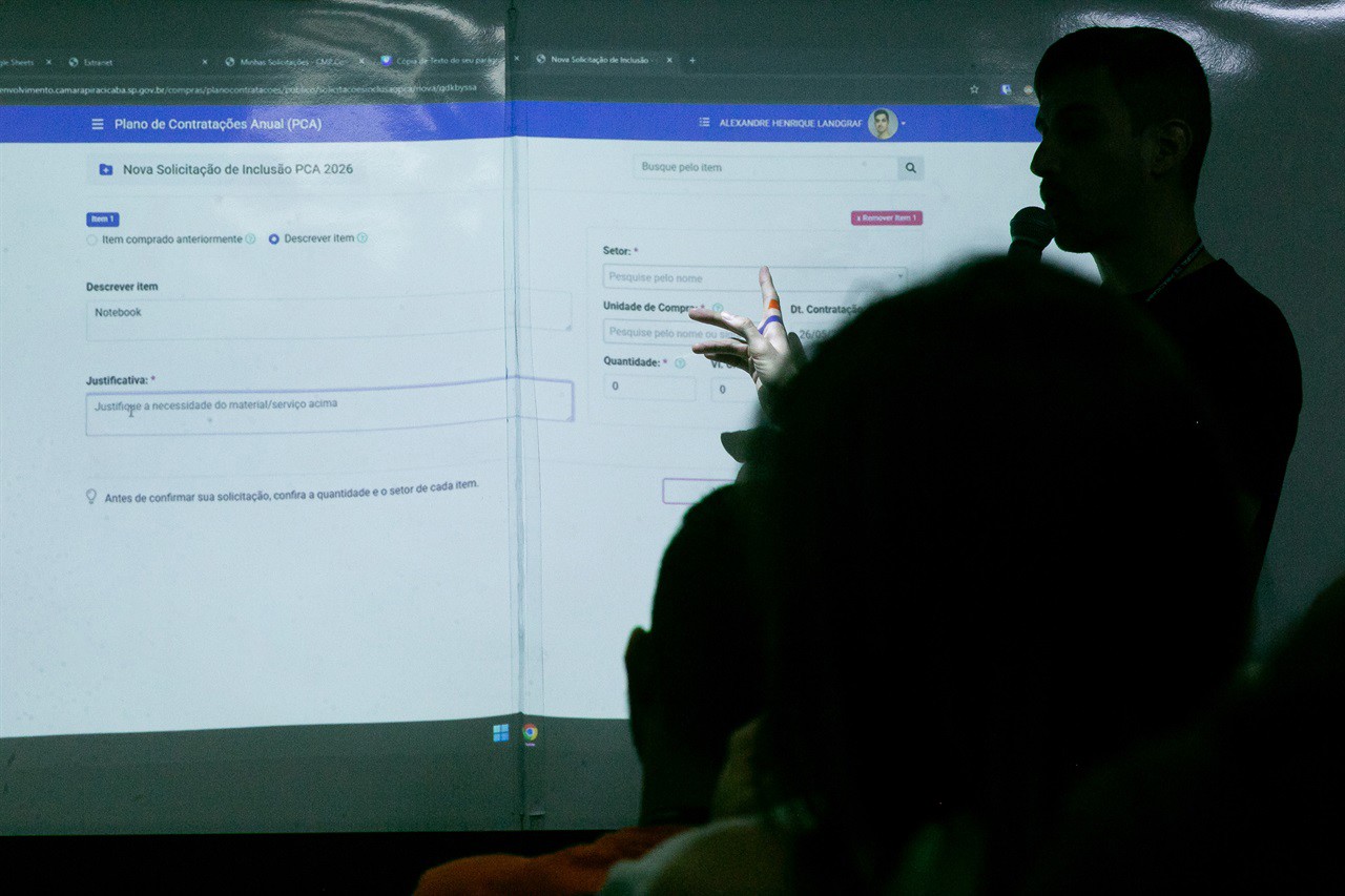 Na sequência do curso, Alexandre Landgraf, chefe do Setor de Desenvolvimento de Sistemas, explicou aos servidores as funcionalidades da plataforma online fornecida pela Câmara para inserir as intenções de compras e contratações necessárias no próximo ano, num processo que exigirá do setor, departamento ou gabinete solicitante informações como a descrição do serviço ou produto pretendido e a quantidade requerida para ele.