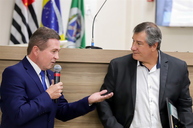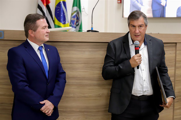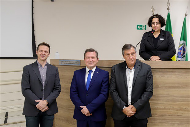 Os professores Alberto Martins Júnior, coordenador do curso de administração da EEP, e Marcelo Zambom, diretor acadêmico da instituição, agradeceram a homenagem aprovada pela Câmara.