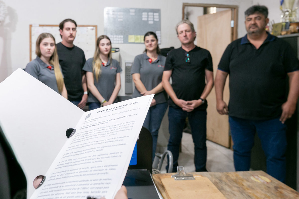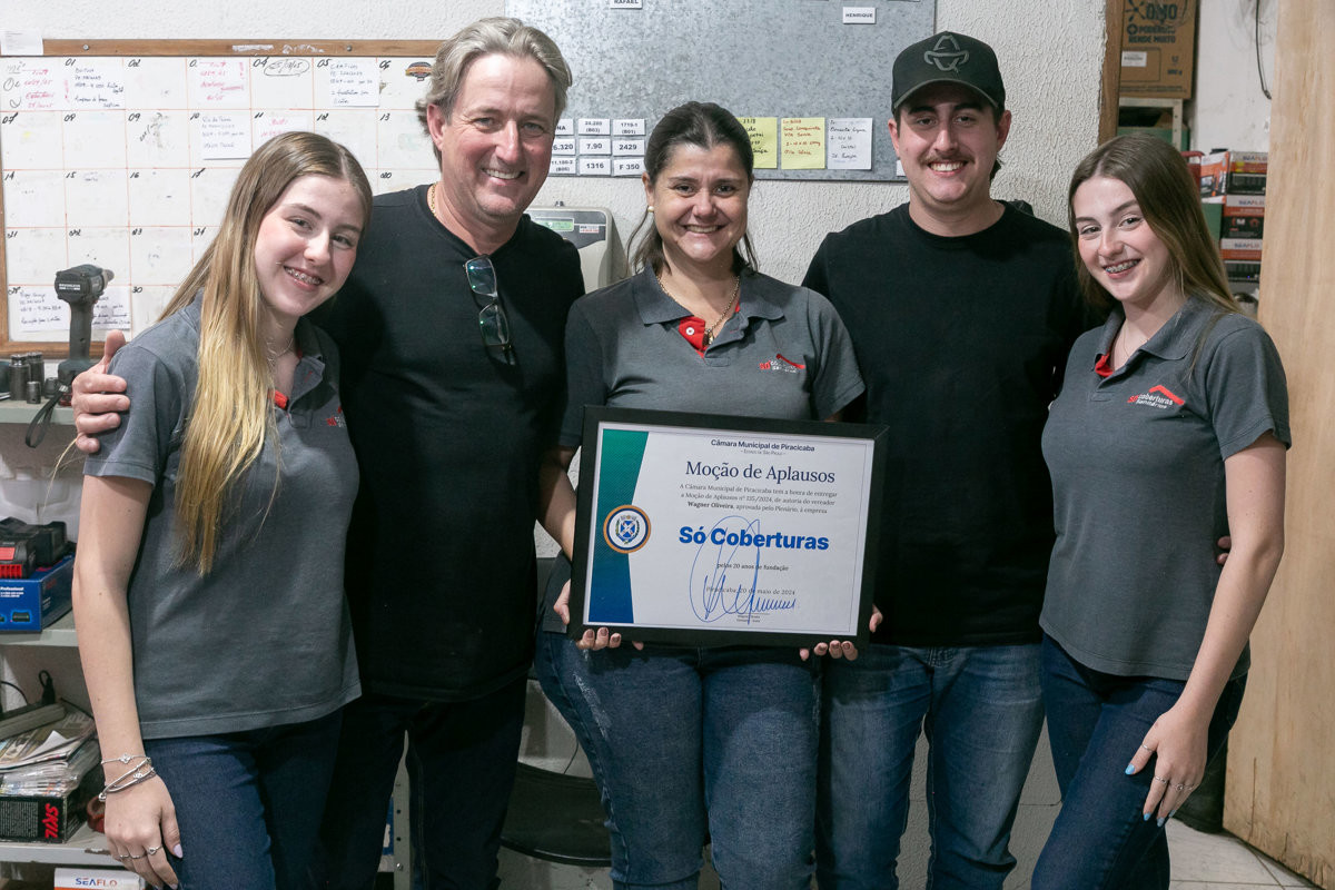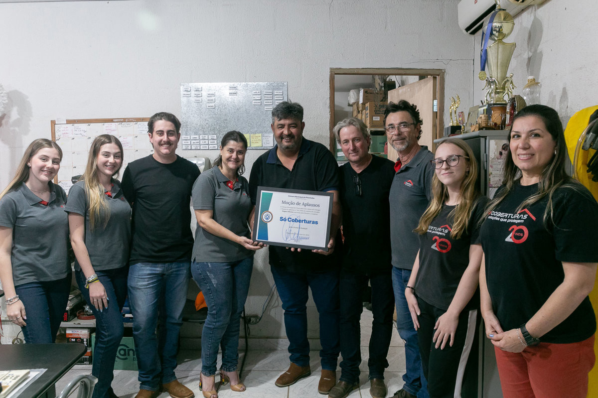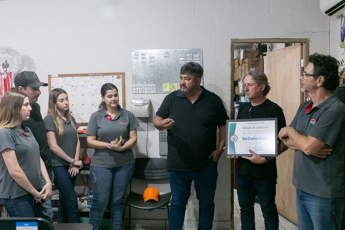 Funcionários acompanharam o ato de entrega, na sede da empresa, na região do Água Branca. Wagnão enalteceu os esforços de Luis Fernando Tonin, que capitaneia os negócios junto com a esposa, Ana Paula Tonin, e o sócio, Reginaldo Matheucci. O vereador ressaltou a resiliência da Só Coberturas, que durante a pandemia buscou outras áreas de atuação em razão da paralisação do setor de eventos na época.