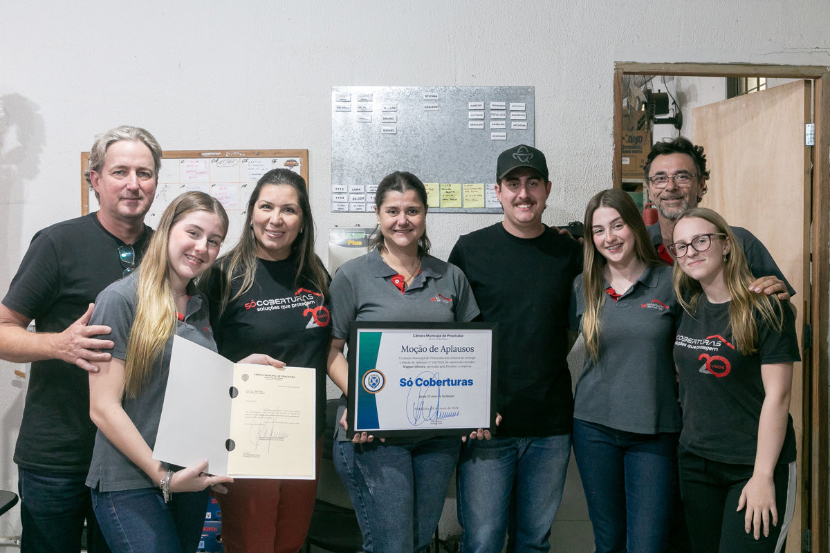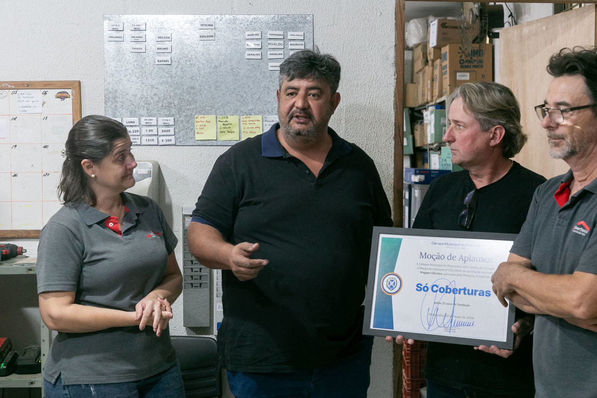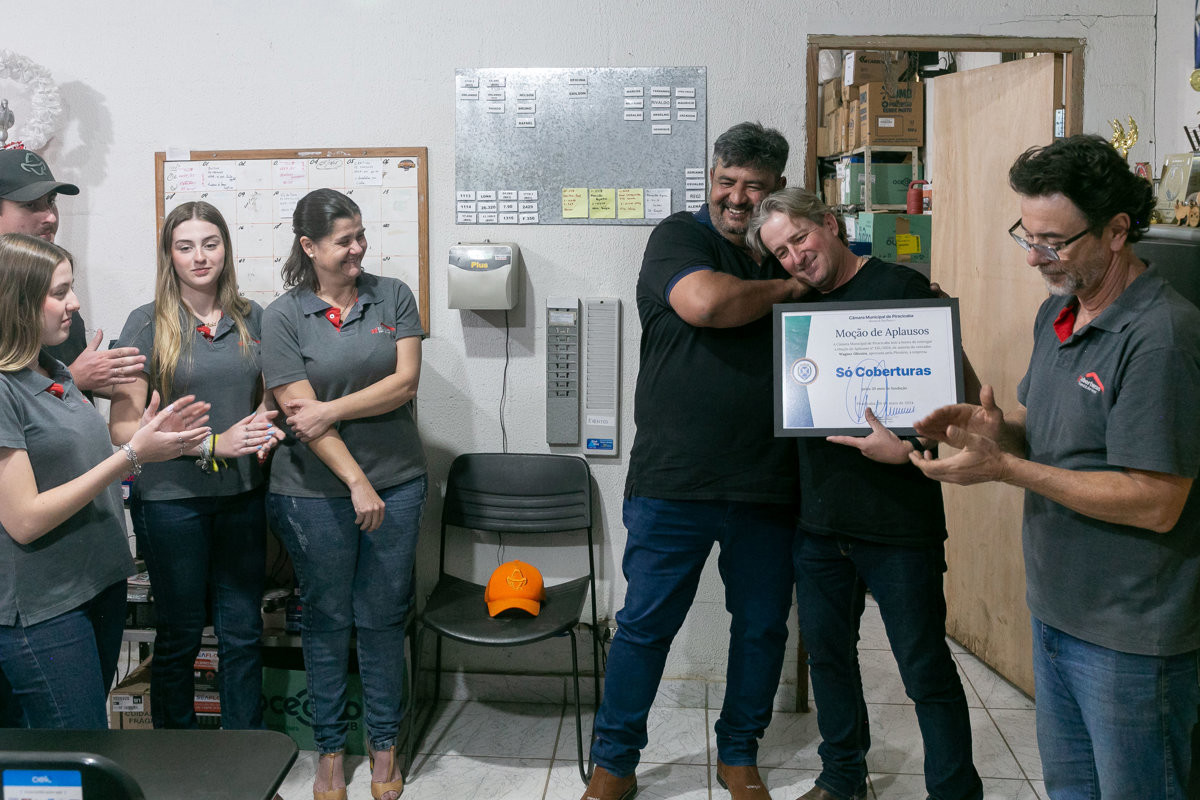 "Estou no terceiro mandato e, nessa jornada dentro do Poder Legislativo, se eu dei quatro moções de aplausos foi muito. Tenho escolhido a dedo, com a cautela de homenagear as pessoas que eu realmente conheço, que eu vejo a trajetória. A Só Coberturas começou na Paulista e hoje a vemos montando a Festa das Nações, a Festa do Peão", exemplificou o vereador, que destacou a humildade e o comando exercido por Tonin.