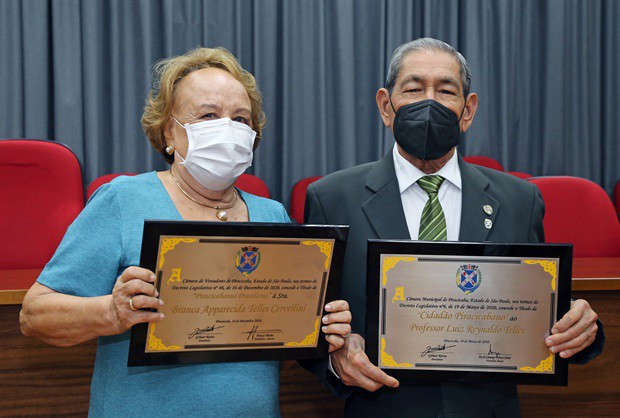 Na primeira reunião solene na Câmara Municipal de Piracicaba em 2022, os irmãos Luiz Reynaldo Telles e Branca Aparecida Telles Cervelini foram homenageados, na noite desta quinta-feira (27), com os títulos, respectivamente, de Cidadão Piracicabano, proposto pelo vereador Ary Pedroso Jr. (Solidariedade), e Piracabanus Praeclarus, iniciativa da ex-vereadora Nancy Thame (PV), mas com a entrega solicitada pela vereadora Silvia Morales (PV), do mandato coletivo “A Cidade É Sua”.