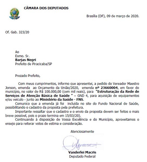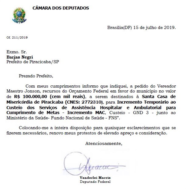 Também a pedido de Maestro Jonson, a Santa Casa de Piracicaba recebeu, por meio da emenda parlamentar 23.660.004, de Vanderlei Macris, R$ 100 mil destinados à estruturação da rede de serviços de atenção básica de saúde e outros R$ 100 mil para o incremento temporário ao custeio dos serviços de assistência hospitalar e ambulatorial para cumprimento de metas.