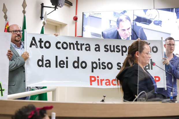 “Vim aqui representando tanto os técnicos quanto as auxiliares”, disse a enfermeira Estela Rossi. “Gostaria de lembrar que a nossa categoria teve o maior número de óbitos durante a pandemia e que a busca pelo piso é uma briga de há mais de 20 anos no Congresso”, disse. A Mesa Diretora autorizou a suspensão extraordinária da reunião para que ela pudesse expressar o apoio à moção durante os trabalhos legislativos da Câmara de Piracicaba.