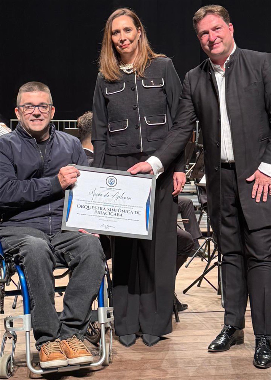 O vereador André Bandeira (PSDB) entregou à OSP (Orquestra Sinfônica de Piracicaba) a moção de aplausos 57/2025, por seus 125 anos de atuação no cenário cultural do município. A homenagem ocorreu na noite de sexta-feira (30), no Teatro Municipal Dr. Losso Netto, momentos antes da apresentação do concerto “Uma Noite na Ópera”.