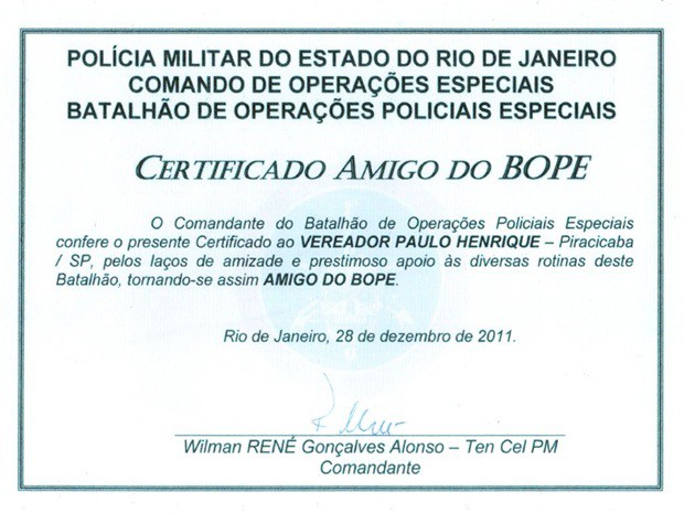 O vereador Paulo Henrique Paranhos Ribeiro (PRB) recebeu no dia 28 de dezembro do Comandante do Batalhão de Operações Policiais Especiais (BOPE), Tenente Coronel PM Wilman René Gonçalves Alonso, o Certificado Amigo do BOPE, destinado a pessoas que prestaram serviços de relevância ao Batalhão.