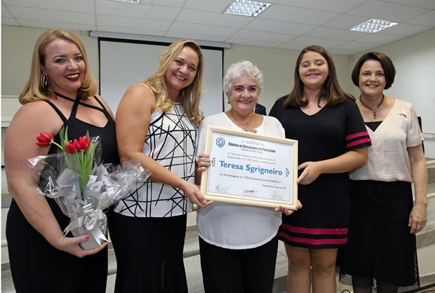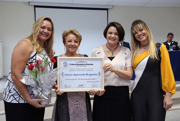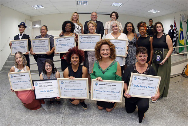 Autoras da solenidade, as vereadoras Adriana Cristina Sgrigneiro Nunes, a Coronel Adriana (CID), e Nancy Thame (PSDB) destacaram a trajetória de vida da médica Adriana Brasil, da enfermeira Clarice Bragantini, da advogada Paulina Sampaio de Aguiar Silva, da educadora física Priscila Lima Pedrassani, da policial militar Rosângela Ilech, da guarda civil Sheila Mayara Valverde, da enfermeira Tatiana Bonini, da cozinheira Teresa Sgrigneiro e da aposentada Zilda Gomes.