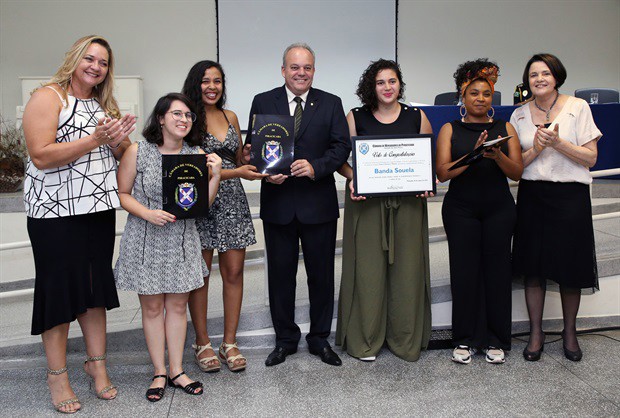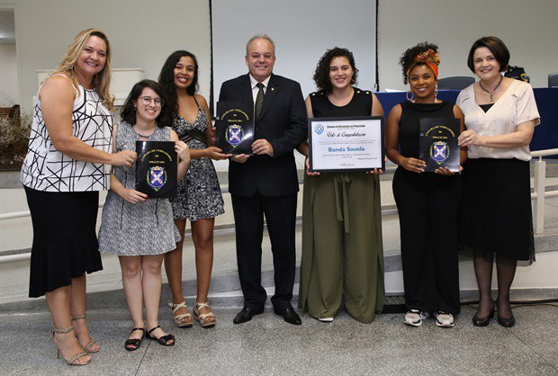 Além das homenageadas pelo Dia Internacional da Mulher, a solenidade também teve a entrega de voto de congratulações à banda Souela. Autora do requerimento 178/2020, Nancy Thame enalteceu o grupo pelo projeto artístico voltado ao empoderamento feminino. "É com imensa alegria que concedemos esse voto. Queríamos muito nesta noite que um grupo de juventude ligado à arte e à musica estivesse conosco", afirmou.