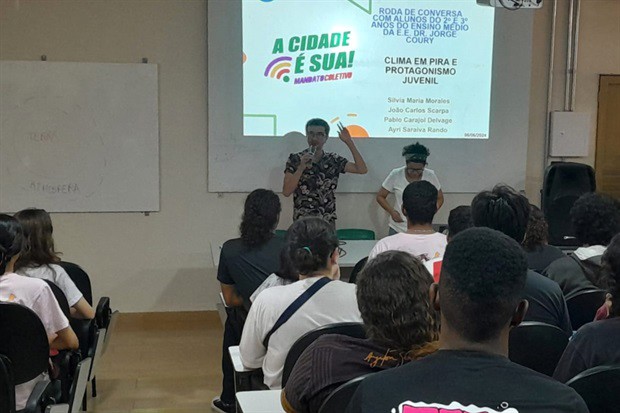 A primeira ação realizada pelo mandato coletivo envolveu estudantes do ensino médio das escolas estaduais "Luciano Guidotti" e "Dr. Jorge Coury", nos dias 3, 6 e 10. O intuito foi possibilitar ao público jovem o acesso qualificado a informações referentes às mudanças climáticas e debater com ele as políticas climáticas de Piracicaba.